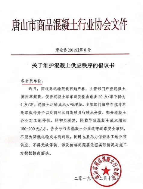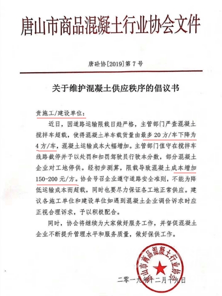 据数了解,此次限超令规定,混凝土搅拌车最大运输量仅为5立方米,与之前相比运力下降近70%左右,运输成本上涨150-200元/立方米。而在限超令发布后,唐山混凝土协会针对各混凝土公司下发文件明确要求不可断供,必需保障市场供应。因此,混凝土公司在成本上涨的压力下,只能大幅上调价格来转嫁成本的增加。